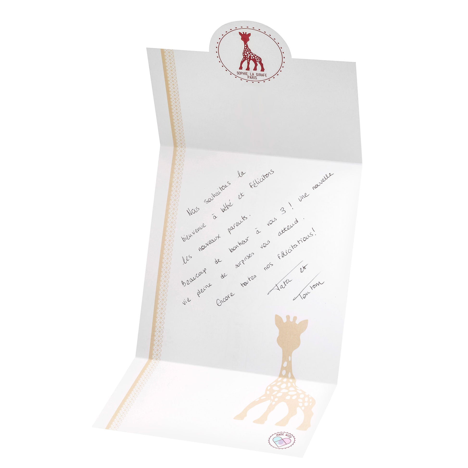 It is offered in a soft and refined case. This set includes our very famous Sophie la girafe teether made of 100% natural rubber and food quality paint and a maracas rattle toy, ideal to keep baby entertained. It is accompanied by a customisable gift card and a beautiful gift bag, this is suitable for the perfect gift.