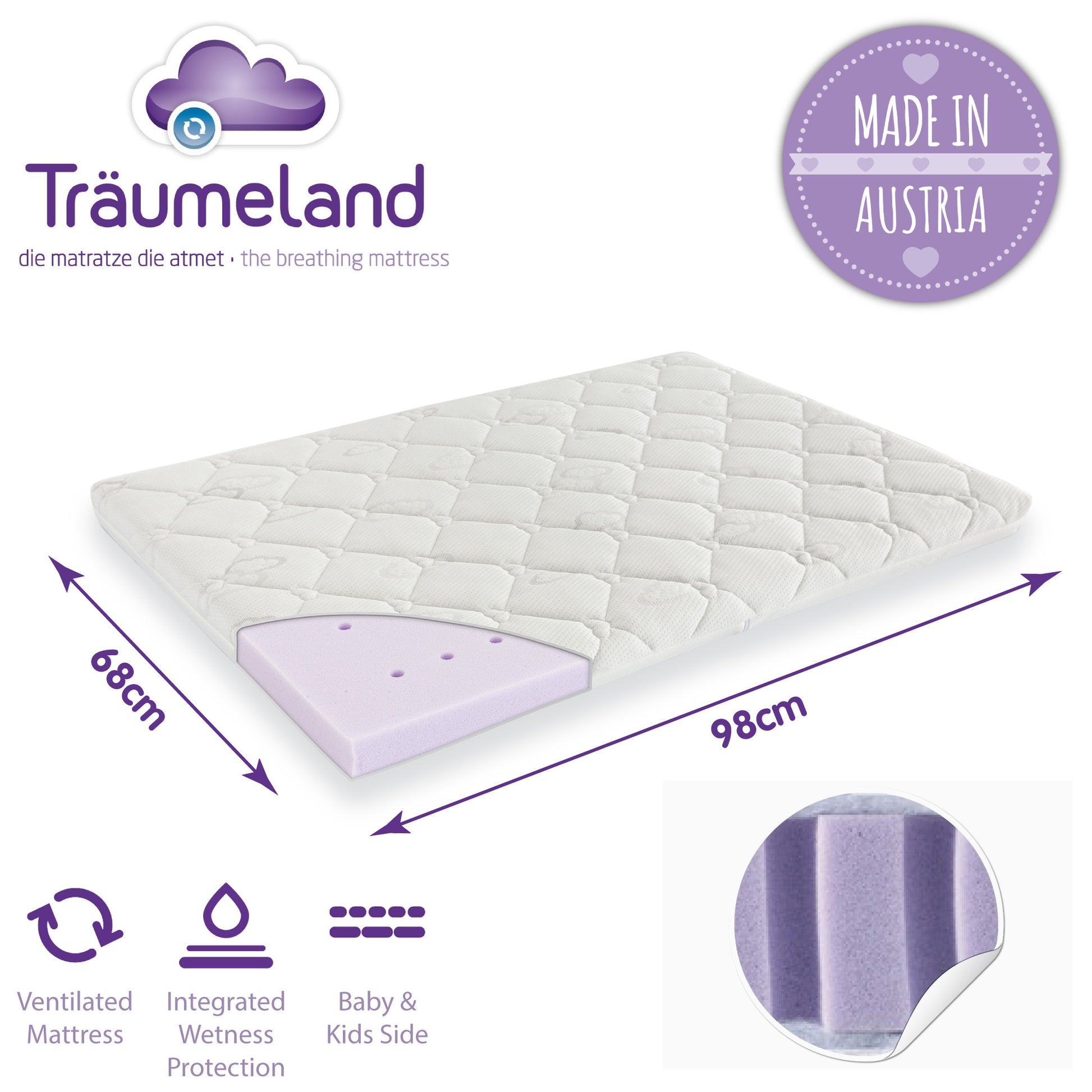 If the child "leaks", the mattress core stays dry, as the moisture is absorbed on the surface. Our "sleep safety" function covers have this integrated wetness protection and provide sufficient absorbency – as long as your baby is wearing a nappy.