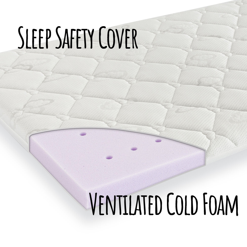 The unique sleep safety multifunctional cover consists of 38 % TENCEL® and 62 % polyester. Quilted with washable fleece, to produce a cuddly lying surface for your baby. The mattress cover is refined with 100% natural lavender and melissa oils which are known for their sleep-promoting effects. The oils help to inhibit bacteria and fungi and are odour-neutral. Air-permeable, washable up to 60 °C and suitable for gentle machine drying. This cover is tested for antimony & harmful substances.